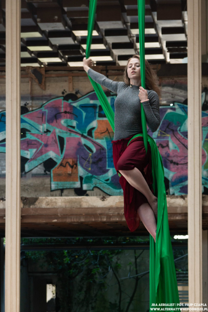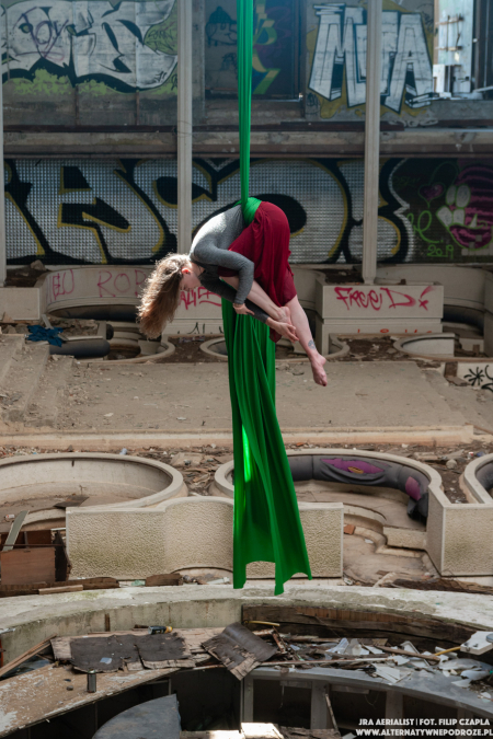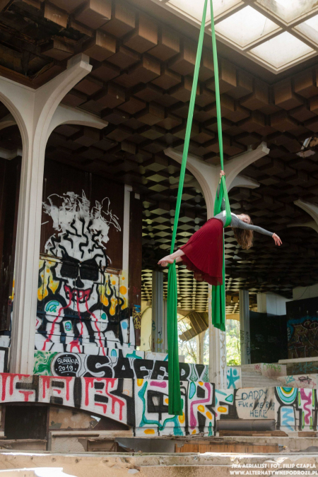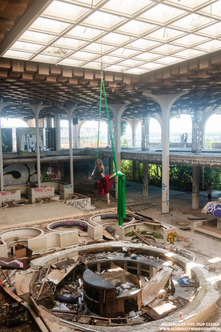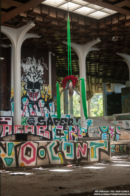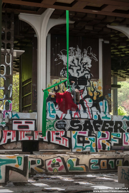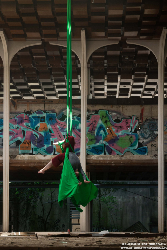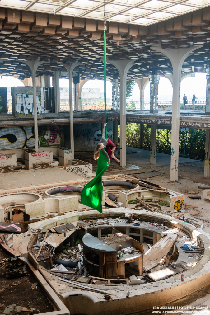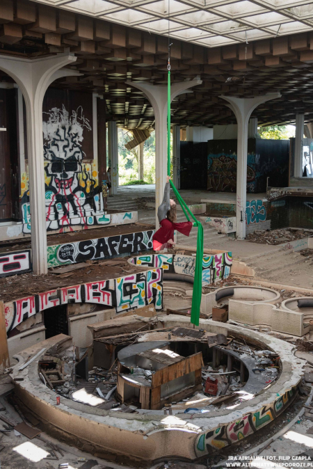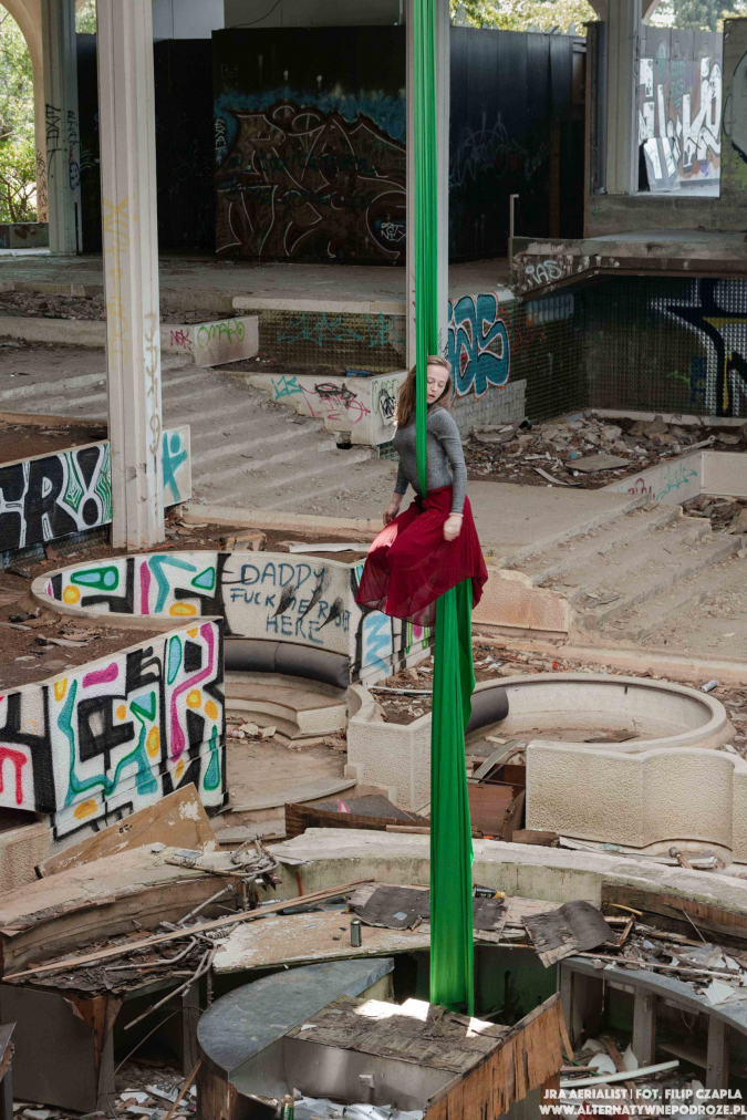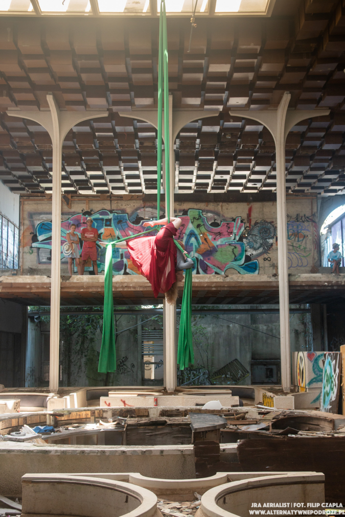 Po lekkim stresie w trakcie wieszania sprzętu i sprawdzania montażu przyszedł czas na prawdziwą magię. Wspinając się po zielonej szarfie nad opuszczonym barem, który kiedyś przelewał się luksusem czułam, że dzieje się coś niezwykłego. Na piętrach dookoła głównego holu zaczęli już pojawiać się pierwsi turyści – przypadkowa widownia, dla której występowałam. I nagle w tym brokatowym body kręcąc się bez opamiętania na 5 metrach poczułam jakbym cofnęła się do czasów świetności tego hotelu. Wtedy kiedy jeden z basenów (ponoć) wypełniony był szampanem, a w luksusach hazard mogli uprawiać tylko zagraniczni goście podjadając kawior. I zaczęłam się zastanawiać jaka muzyka mogła wtedy wypełniać tę przestrzeń… Może jugosławski hit eurowizji 1972 roku, a może bardziej zachodnie American Pie, które było wtedy na listach przebojów.